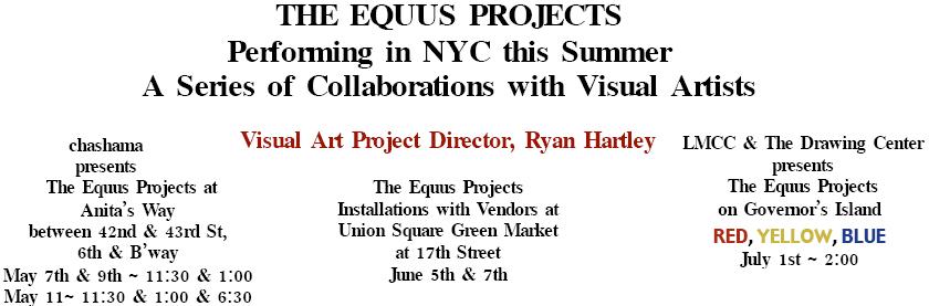 This June, The Equus Projects will create a installation/performance which references the Union Square’s Farmer’s Market when the market is not in operation- Tuesday and Thursday, June 5th and 7th. Partnering with vendors who are present the day before, The Equus Projects will make a piece referencing the items on hand, flow patterns of the market attendees, and many more nuances which will ultimately become the piece. Performances are FREE and at lunch time. Feel free to stop by and watch creativity in action!