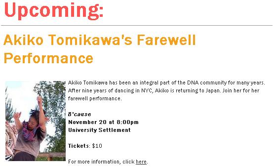 Ang. Performing Project Showcase som blev uppskjutet tills vidare pga Hurricane Sandy, vi kommer visa det stycket på DNA’s teater med lite mer simplare ljus än från början tänkt. Söndag den 18 November kl. 7:30pm. Vi ska även ha med detta stycke i föreställningen på tisdag. Akiko är koreograf även för det stycket, så hon har bestämt sig för att trycka in det i hennes egna show.