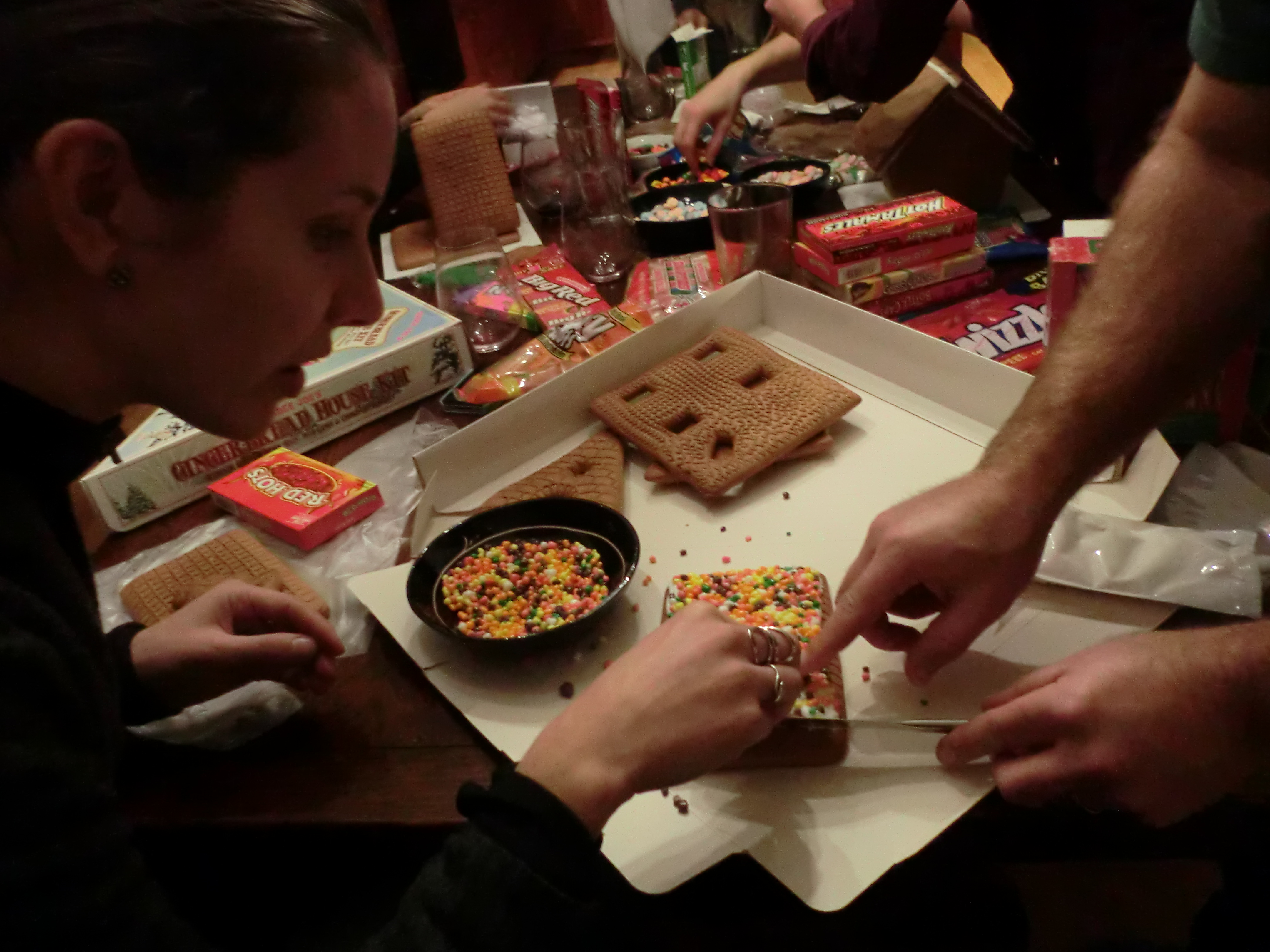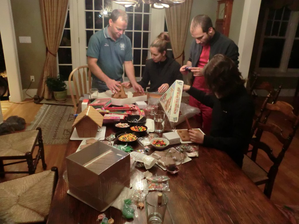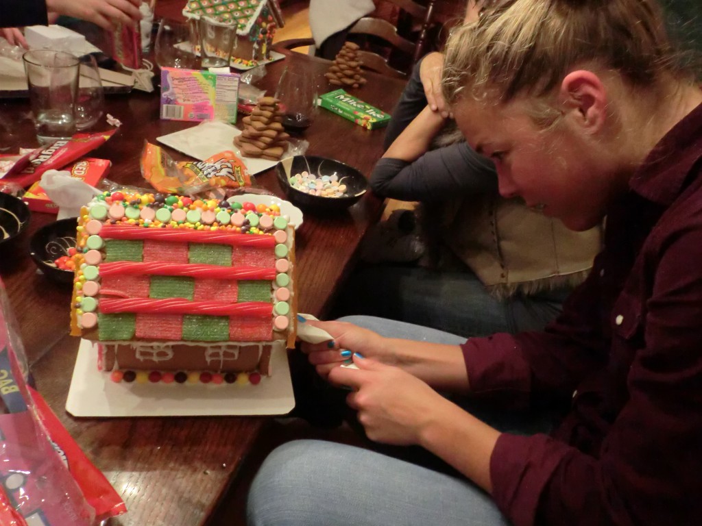 På lördags kvällen byggde vi pepparkakshus. Eller ja, grunden var klar men vi byggde ihop delarna och satte på godis. Jag har faktiskt aldrig gjort pepparkakshus förut. Så roligt att dekorera:) Efteråt hamnade vi framför brasan för att varva ner. Ja, några fick ont i magen efter för mycket godis, själv gillar jag inte det amerikanska godiset så mycket, jag vet ju att det finns bättre i Sverige, så blev bara smakprov av alla konstiga saker för min del.