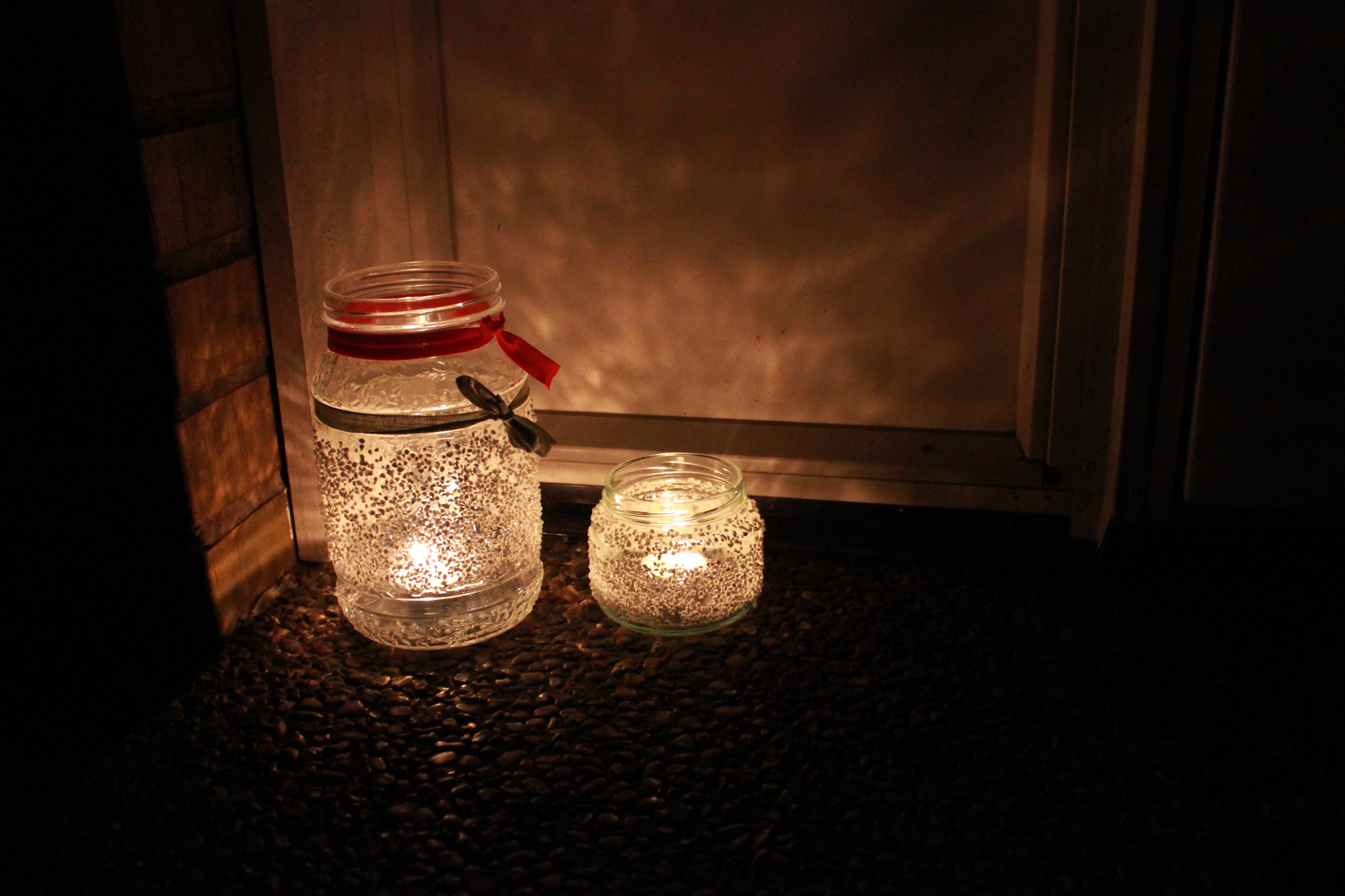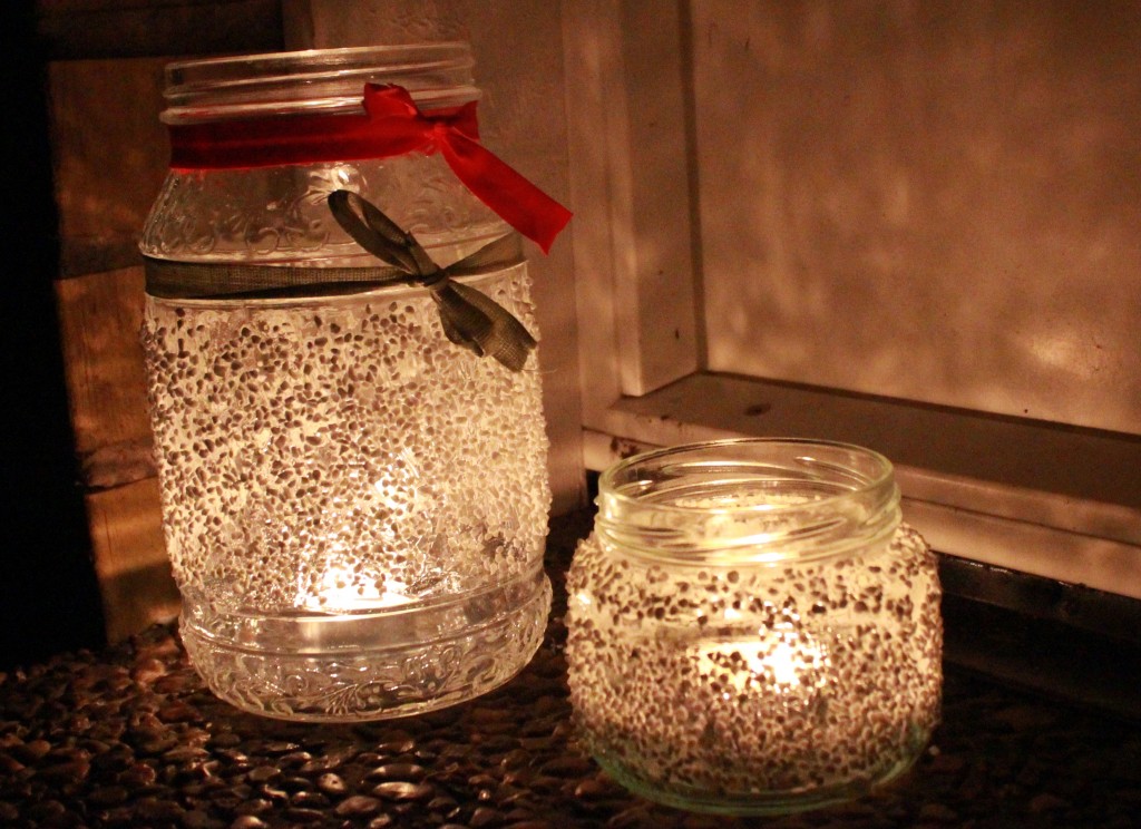 Vad man behöver: * Glasburkar * Lim * Pärlsocker * Värmeljus * Ev. ett band eller tvåVäldigt fint att ha vid ytterdörren, men passar lika bra inne som ute.