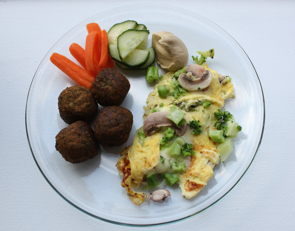 Omelett med svamp, broccoli och lite ost. Falafel. Morot. Gurka. Hummus.