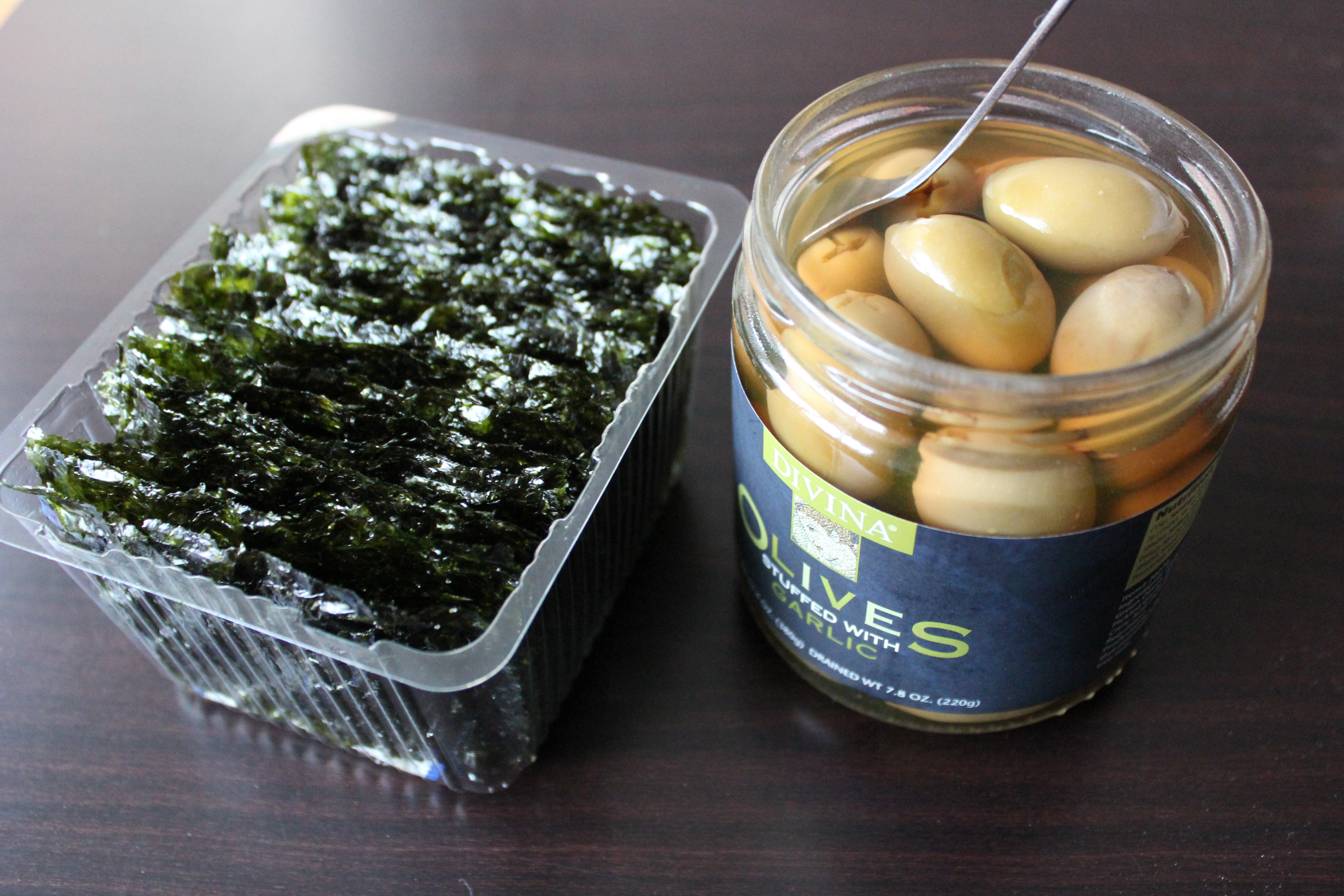 Till mitt kaffe blev det seaweed snack och oliver med vitlok. Konstig kombination, men gott! / With my coffee I had seaweed snack and olives with garlic. Weird combination, but tasty!