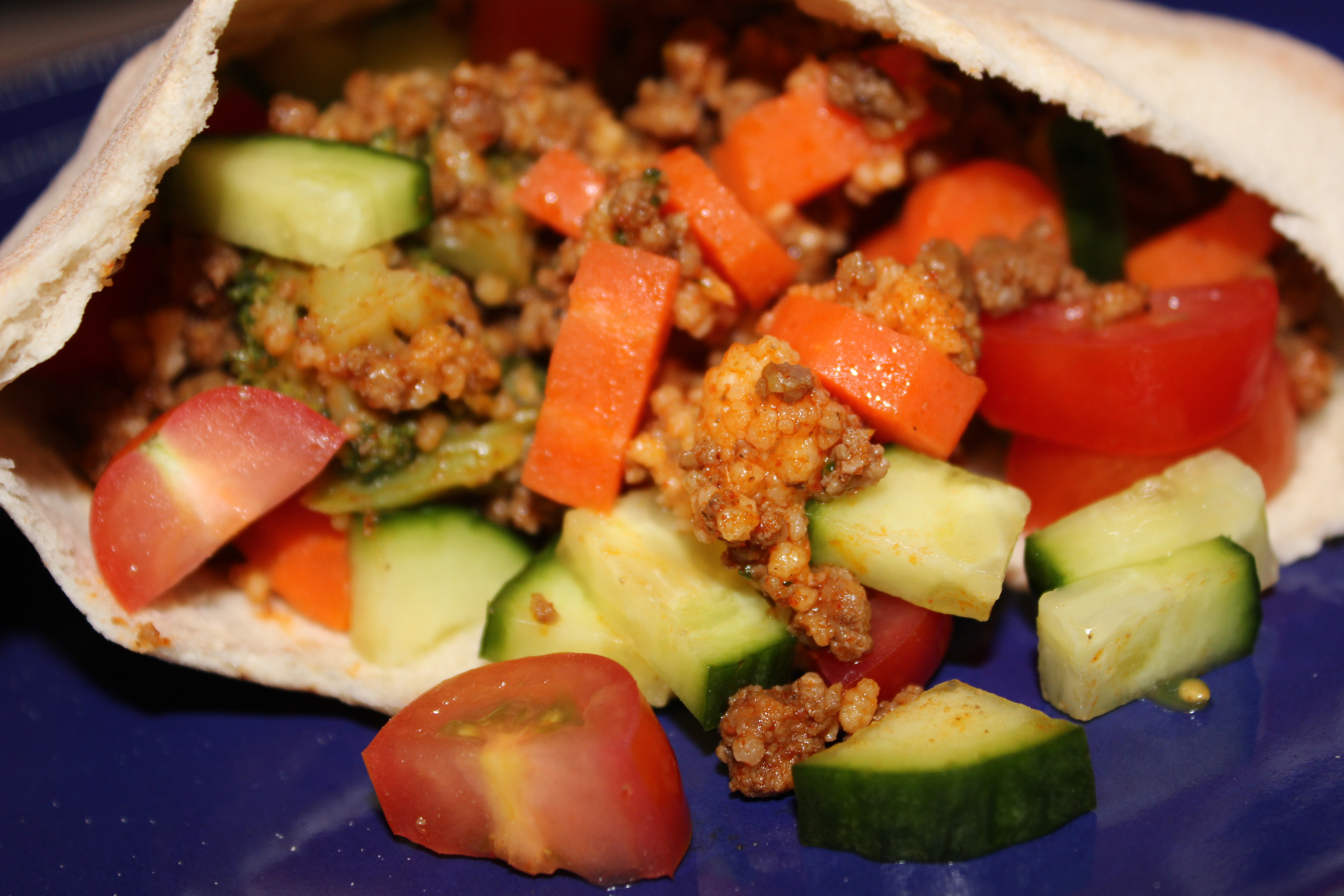 Ground beef with salt pepper and taco spice, mushrooms, green olives, broccoli and garlic. Couscous. Cooked carrots. Cucumber. Tomato. Whole grain pita.
