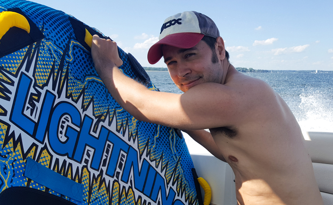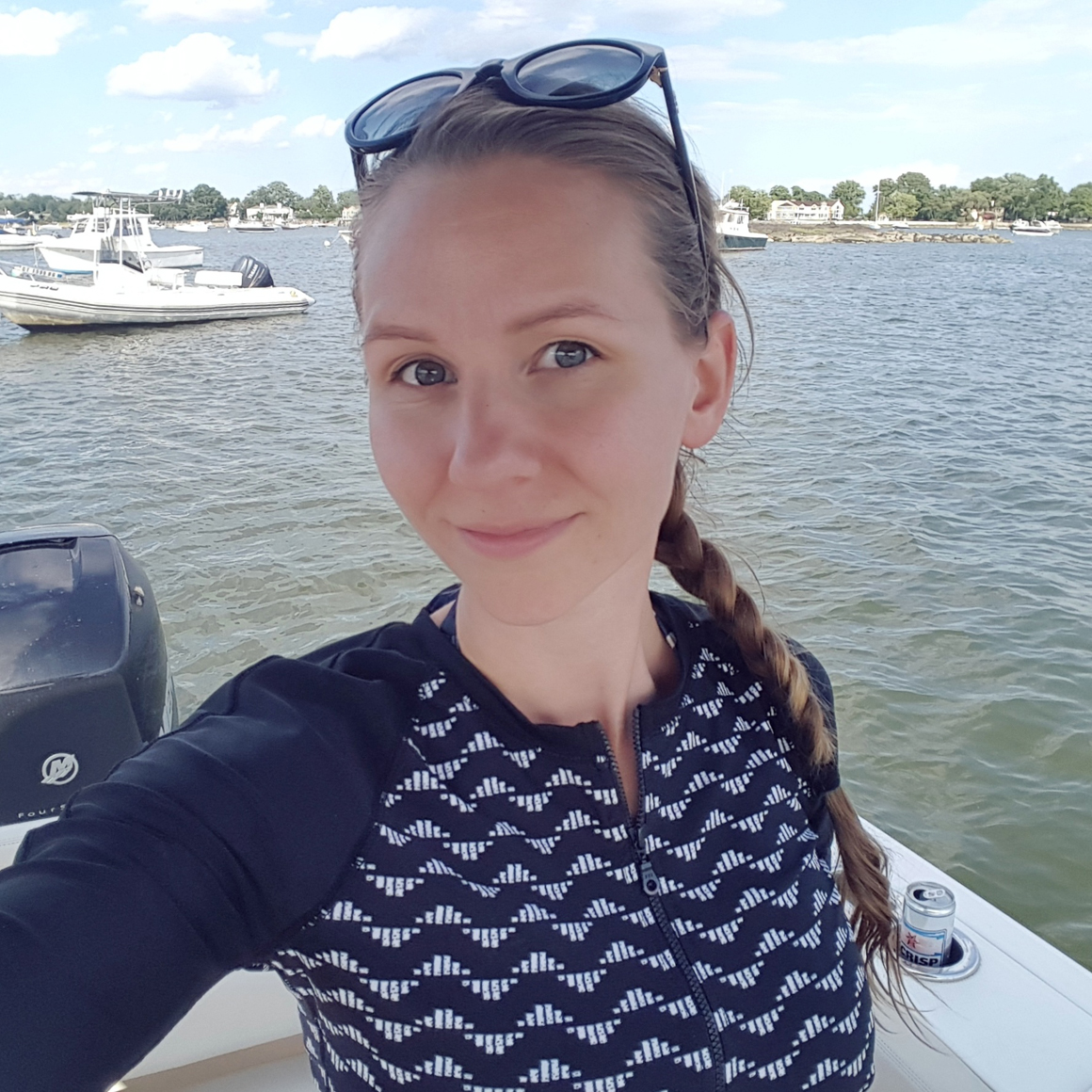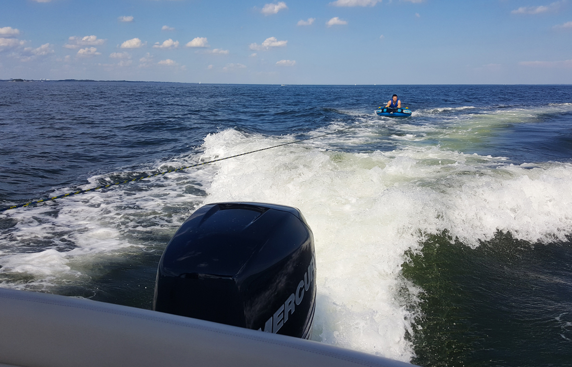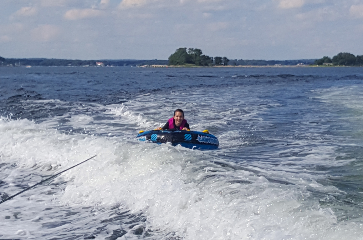 Yesterday, after my husband and Thor came home from work, we were spontaneously invited to join my husbands boss on his boat. We drove down to Larchmont, NY, where they live and together we went to the boat. A nice speedboat that we drove pretty quickly out in the ocean. On the way out we could see the NYC skyline a bit away, always nice to see the city:) Their daughter was excited to go tubing. She looked so happy and wanted to go faster and faster. When she was done it was my turn. I have never done this before but I like to try new things. I figured out pretty quickly that you can steer with your legs. It was so much fun! Then Jim went before we went back to land where their older daughter was waiting.